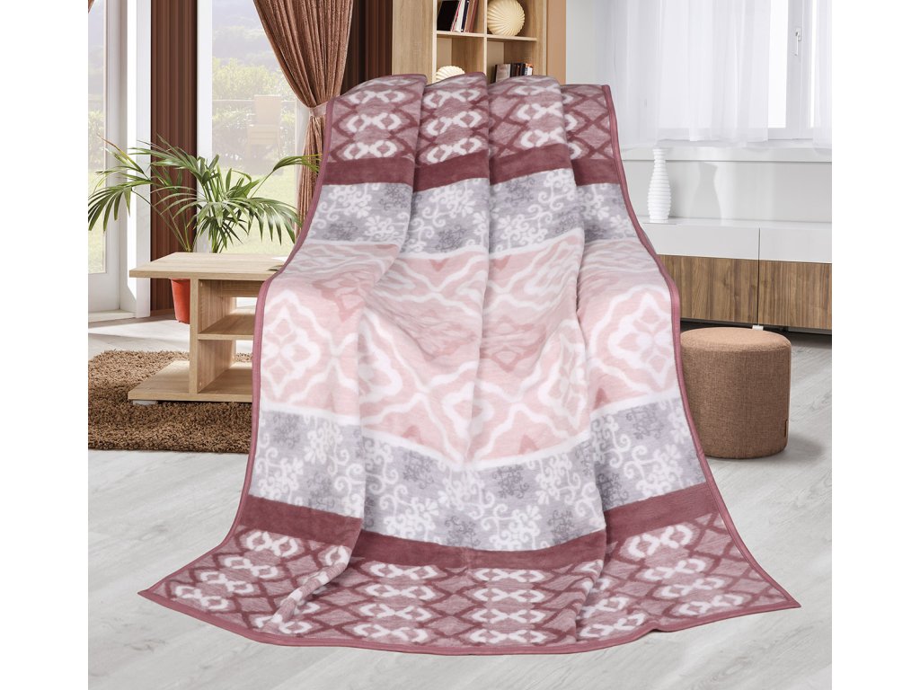 Vzorovaná deka Karmela je díky velkému podílu akrylového materiálu velmi příjemná na omak. Akryl nahrazuje vlněné materiály. Je hřejivá a příjemná na dotek. Je vhodná pro odpočinek, ale lze ji využít i jako letní přikrývku nebo přehoz na pohovku. Deka je oboustranná, lemována po obvodu lemovkou.