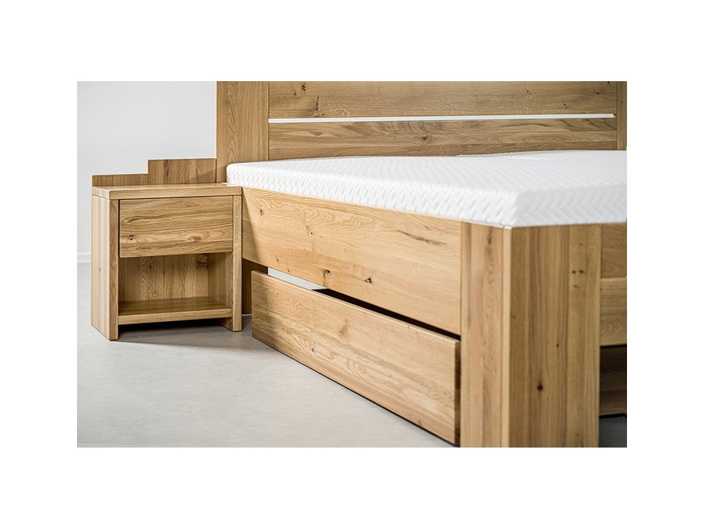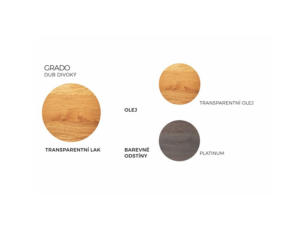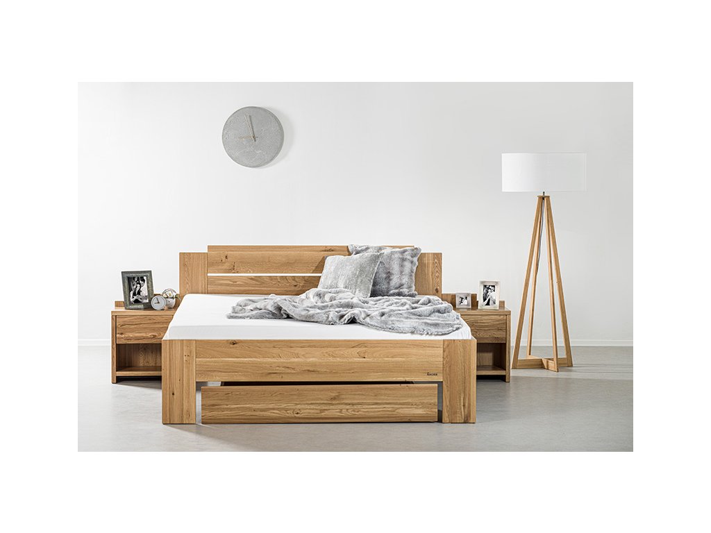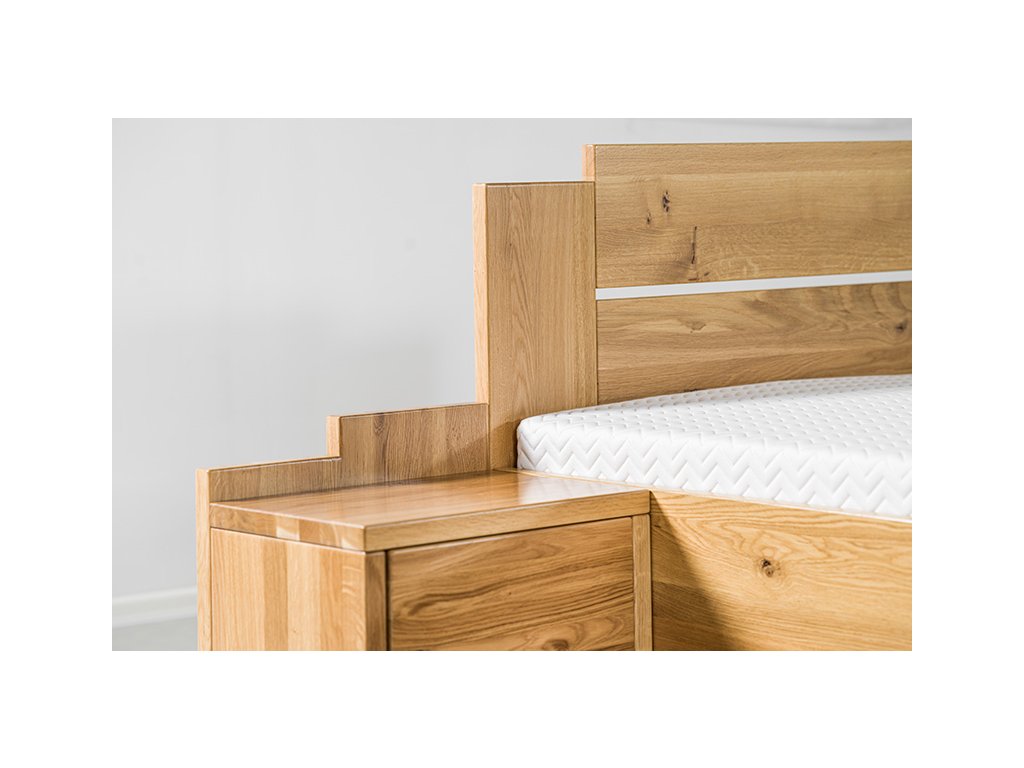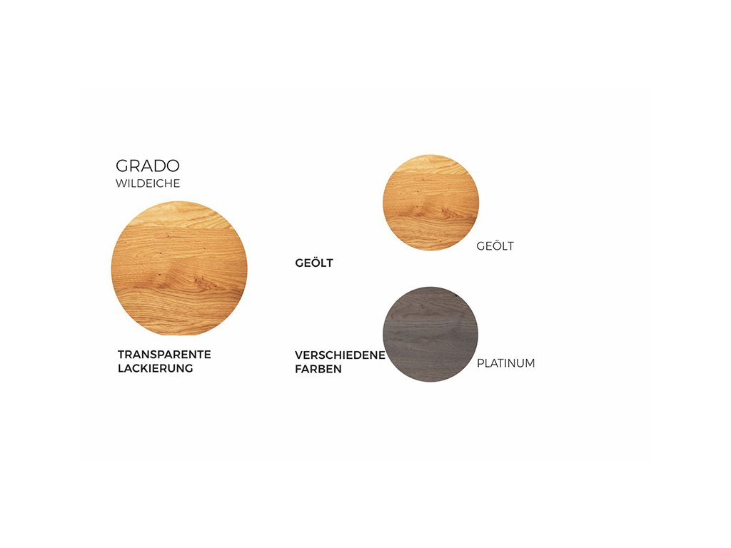 Postel Grado lze pořídit ve dvou dřevinách – elegantním buku a divokém dubu, jenž se vyznačuje výraznou a nezaměnitelnou strukturou dřeva. Viditelné suky a praskliny dodávají posteli jedinečný přírodní vzhled, každá postel je tak originálem. Zdvojené přední nohy zaručí vysokou stabilitu a bytelnost lůžka. Kování lze nastavit do čtyř různých pozic a umístit tak rošt až do výšky 39,5 cm od podlahy. Za pozornost stojí také dominantní čelo s nápadným kaskádovým stupínkem pro nadčasový vzhled.