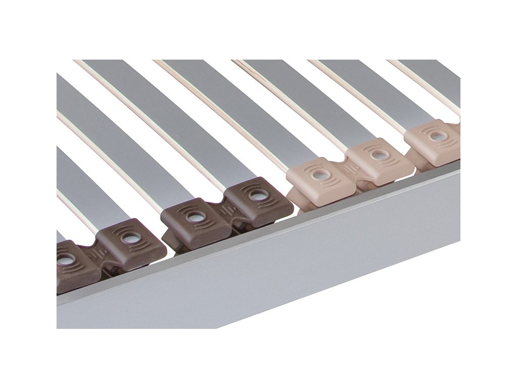 Přizpůsobivý a elegantní rošt vhodný i pro alergiky. Postelový rošt s bočním výklopem pro přístup do úložného prostoru řeší nedostatek místa v ložnici. Zdvih pomocí textilního úchytu usnadní každodenní manipulaci. Pružná pouzdra člení plochu lůžka do 7 anatomických zón s možností regulace tuhosti v bederní části. Speciálně uložená výkyvná pouzdra zaručují vyšší nosnost a odolnost proti prudkému zatížení. Lamely se díky ramenní kolébce pod tlakem ramen stlačí hlouběji, rameno se zaboří a páteř zůstává v přirozeném tvaru. Potažení dřevěných částí fólií značně usnadňuje údržbu a omezuje vytváření bakterií a plísní v posteli.Doplňkové parametry