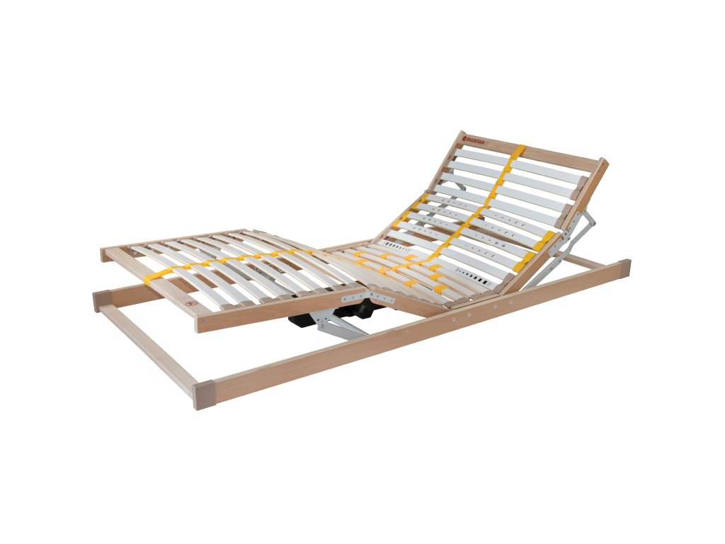Praktický rošt Duostar je skvělou volbou pro pohodlné a zdravé spaní. Motorový rošt Duostar podporuje optimální rozložení váhy těla na matraci. Polohování roštu pomocí kompaktního motoru se dvěma nezávislými pohonnými jednotkami umožňuje zvednutí hlavové i nožní části lůžka. Rošt je svou výškou pouhých 7 cm přizpůsoben do nízkého lůžka, aby se matrace dobře usadila v postelovém rámu a nepřečnívala. Pružné lamely uložené ve dvojicích v kaučukových pouzdrech jsou rozložené do 5 anatomických zón. Vrtané lamely v ramenní oblasti zajišťují nižší tuhost a zmírňují tak tlak na ramena. Středový popruh zlepšuje stabilitu a nosnost roštu. Posuvnými objímkami lze nastavit individuální tuhost v bederní části. Lamely opatřené fólií mají schopnost zachytávat pod matrací méně prachu, zamezují zatrhávání potahu a přenášení vlhkosti z matrace do roštu, což je plus, které ocení především lidé s alergií. Tento rošt je dodáván s dálkovým šňůrovým ovládáním.