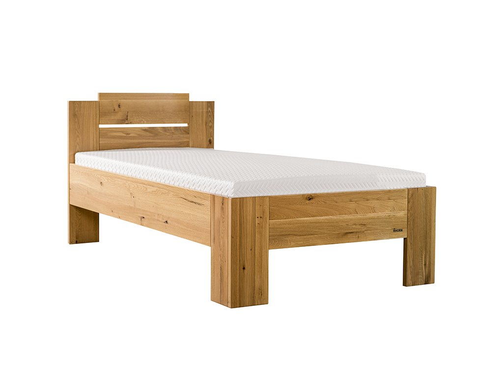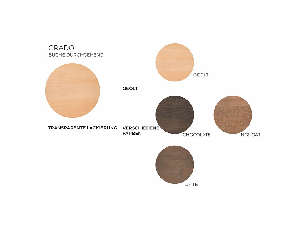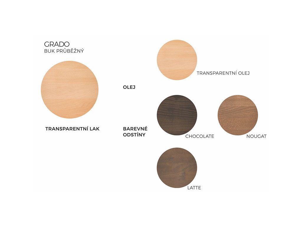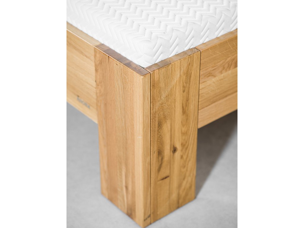 Postel Grado lze pořídit ve dvou dřevinách – elegantním buku a divokém dubu, jenž se vyznačuje výraznou a nezaměnitelnou strukturou dřeva. Viditelné suky a praskliny dodávají posteli jedinečný přírodní vzhled, každá postel je tak originálem. Zdvojené přední nohy zaručí vysokou stabilitu a bytelnost lůžka. Kování lze nastavit do čtyř různých pozic a umístit tak rošt až do výšky 39,5 cm od podlahy. Za pozornost stojí také dominantní čelo s nápadným kaskádovým stupínkem pro nadčasový vzhled.Parametry dodatkowe