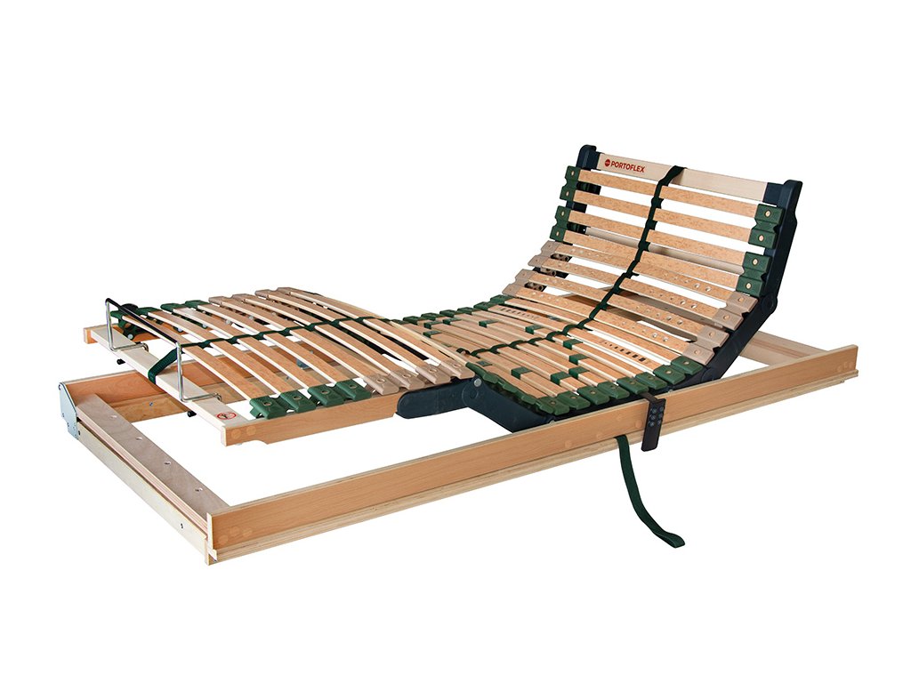 Speciálně vyvinutý motorový rošt s bočním výklopem Portoflex Motor Kombi je originálem na trhu chráněný průmyslovým vzorem pro EU. Rošt 2v1 v sobě spojuje jak maximální pohodlí při odpočinku a spánku, tak i praktičnost pro snadný přístup do úložného prostoru pod postelí. Extra ploché provedení s motorem uloženým v konstrukci rámu roštu umožňuje plné využití úložného prostoru pod lůžkem. Speciálně uložená výkyvná pouzdra zaručují vyšší nosnost a odolnost proti prudkému zatížení. Pružné lamely v 7 anatomických zónách se natáčejí a reagují na pohyb těla při spánku. Každá část těla je tak individuálně podepřena. Změkčení v ramenní oblasti je správnou oporou páteře při spánku na boku. Středový popruh zlepšuje stabilitu roštu. Posuvnými objímkami lze nastavit individuální tuhost v bederní části. Lamely opatřené folií zabraňují pronikání vlhkosti do roštu a usnadní údržbu roštu. Madlo zajistí, že matrace při polohování zůstane na svém místě. Tento rošt je dodáván s dálkovým bezšňůrovým ovládáním. Součástí tohoto ovládání je i přídavné LED osvětlení pod postelí, které oceníte například při nočním vstávání. K roštu doporučujeme poddajné matrace do hmotnosti 30 kg.Doplňkové parametry