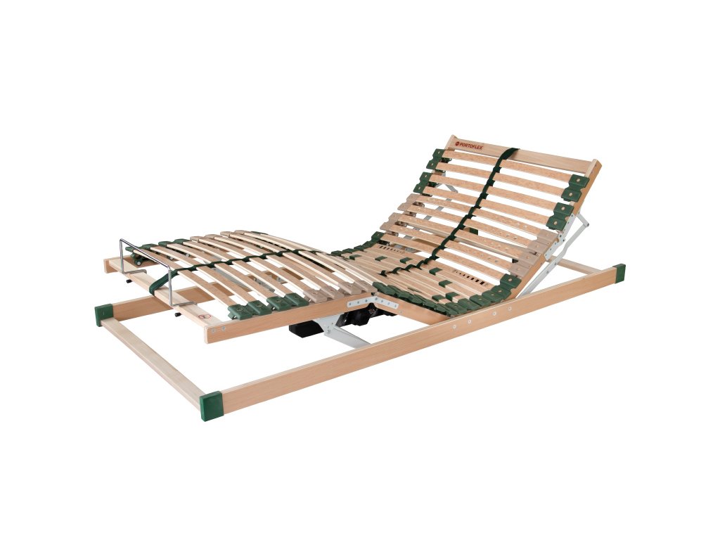 Pohodlný a odolný motorový rošt s pouzdry uloženými nad bočnicí poskytuje vyšší komfort při spánku. Motorový rošt umožňuje nezávislé polohování hlavy a nohou. Funkce MEMORY nabízí možnost uložení jedné pozice do paměti ovladače. Tlačítko FLAT slouží k jednoduchému sjezdu napolohovaného roštu do základní polohy. Speciálně uložená výkyvná pouzdra zaručují vyšší nosnost a odolnost proti prudkému zatížení. Pružné lamely v 7 anatomických zónách se natáčejí a reagují na pohyb těla při spánku. Každá část těla je tak individuálně podepřena. Změkčení v ramenní oblasti je správnou oporou páteře při spánku na boku. Středový popruh zlepšuje stabilitu roštu. Posuvnými objímkami lze nastavit individuální tuhost v bederní části. Lamely opatřené folií zabraňují pronikání vlhkosti do roštu a usnadní údržbu roštu. Madlo zajistí, že matrace při polohování zůstane na svém místě. Tento rošt je dodáván pouze s dálkovým bezšňůrovým ovládáním.